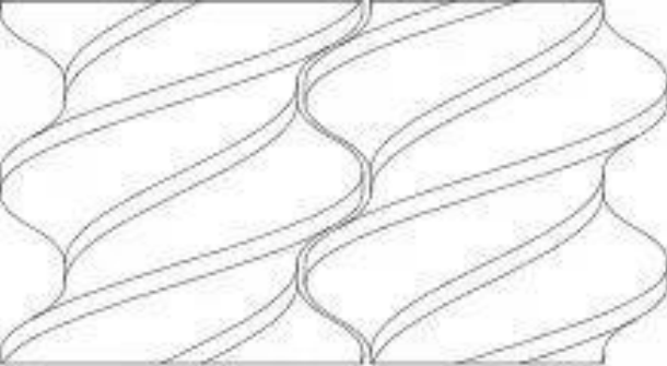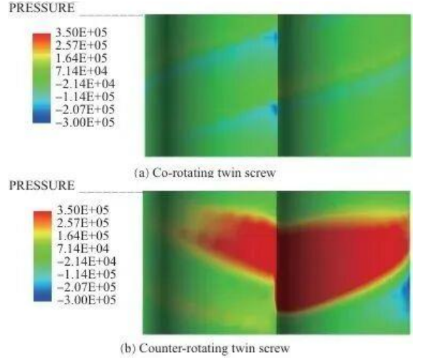 В процессе двухшнековой экструзии с однонаправленным вращением давление в проточном канале колеблется. Обращаясь к конструкции после посадки с двумя винтами, вращающимися в одном направлении (рис. 4), обнаруживается, что колебания давления колеблются вверх и вниз в зависимости от положения гребня винта. Это связано с тем, что гребень винта представляет собой сильно выступающую часть поверхности шнека, а экструдированный материал подвергается более сильному экструзионному и сдвиговому усилию при прохождении через гребень винта, поэтому давление в месте гребня винта часто бывает относительно высоким.