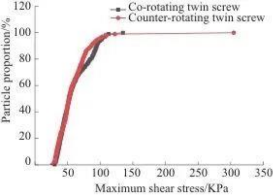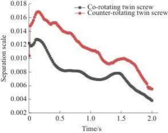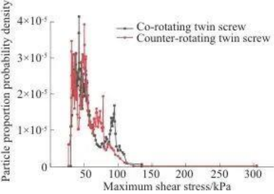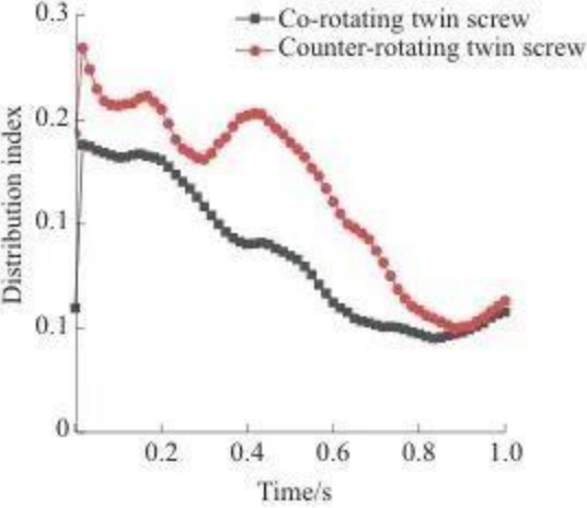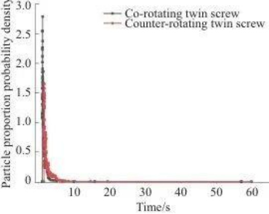 В двухшнековом двигателе, вращающемся в одном направлении, большинство частиц концентрируются за период от 1,00 до 1,99 секунды, а в двухшнековом двигателе, вращающемся в противоположных направлениях, большинство частиц концентрируются за период от 1,48 до 2,97 секунды. Соответствующая кривая двухшнекового двигателя, вращающегося в одном направлении, находится дальше влево, а пик выше, что указывает на то, что пропускная способность двухшнекового двигателя, вращающегося в одном направлении, выше. Причиной этого явления может быть то, что во время процесса двухшнековой экструзии с однонаправленным вращением материал принудительно транспортируется шнеком по траектории в форме буквы «∞».