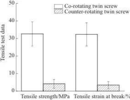 Прочность на разрыв и деформация при разрыве шлицев материала, экструдированных посредством двухшнековой экструзии с однонаправленным вращением, были немного выше, чем у тех, которые экструдировались посредством двухшнековой экструзии с противоположным вращением.