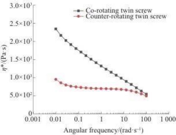 Из-за структурных различий двухшнековый винт, вращающийся в противоположных направлениях, обладает более сильной диспергирующей и перемешивающей способностью, а молекулярная цепь разрывается более полно. Следовательно, η* материала, экструдированного двухшнековым винтом, вращающимся в противоположных направлениях, ниже, чем у двухшнекового двигателя, вращающегося в одном направлении.