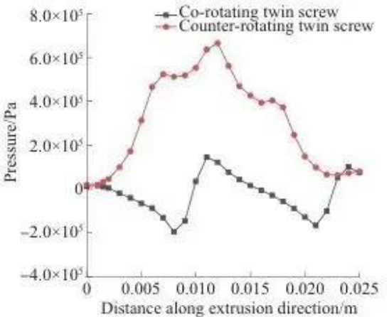 При двухшнековой экструзии с встречным вращением давление в литнике сначала увеличивается, а затем уменьшается в направлении экструзии, а в среднем положении возникает локальное высокое давление. Обращаясь к конструкции двухшнековой посадки, вращающейся в противоположных направлениях (рис. 5), можно обнаружить, что локальное высокое давление возникает в точке зацепления в середине направления экструзии. Это связано с тем, что два шнека вращаются в противоположных направлениях, а поток материала неравномерен или блокируется в процессе экструзии, который накапливается в среднем положении и затем образует локальное высокое давление в канале.