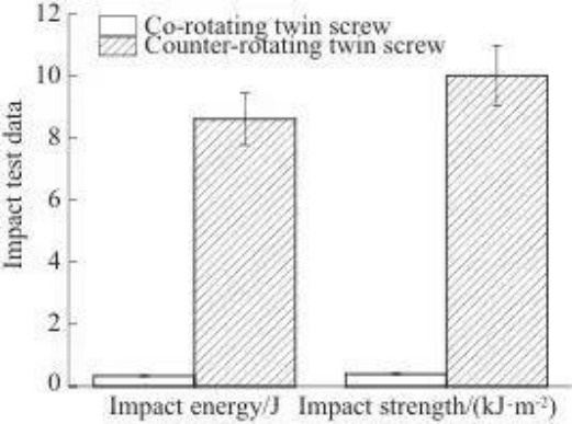 Поглощение энергии удара и ударная вязкость шлицов материала, экструдированных при экструзии с противоположным шнеком, немного выше, чем у шлицев, экструдированных при экструзии со встречным шнеком.