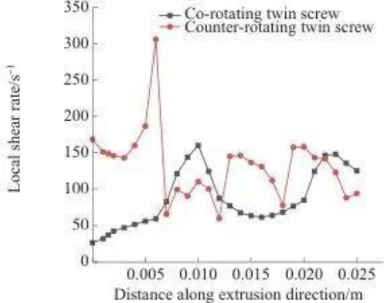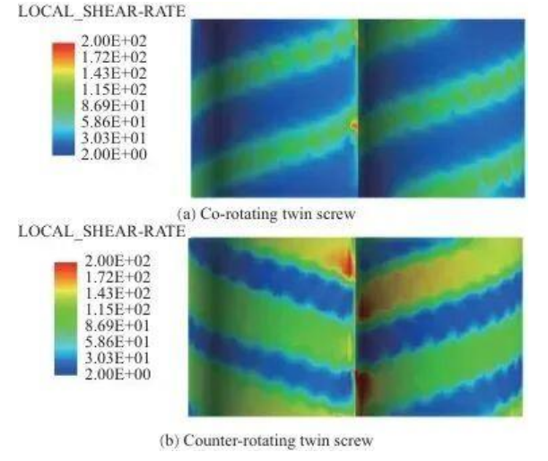 Как при двухшнековой экструзии с однонаправленным вращением, так и при двухшнековой экструзии с противоположным вращением скорость сдвига выше на гребне шнека и ниже в канавке шнека. Причина этого явления заключается в том, что материал течет быстрее в узких зазорах, а зазор между винтовыми гребнями и внутренней стенкой цилиндра меньше, поэтому скорость сдвига выше, а зазор между винтовыми канавками и внутренней стенкой цилиндра больше, поэтому скорость сдвига ниже.